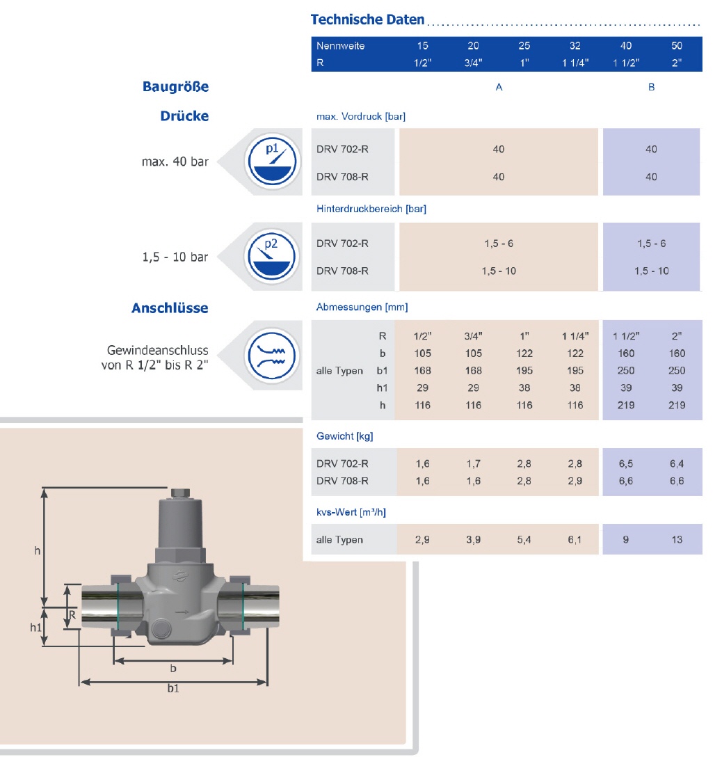 Druckminderer und verfügen über eine Vordruckkompensation. Die Kartuschenkonstruktion erlaubt einen einfachen Austausch der Innenteile.