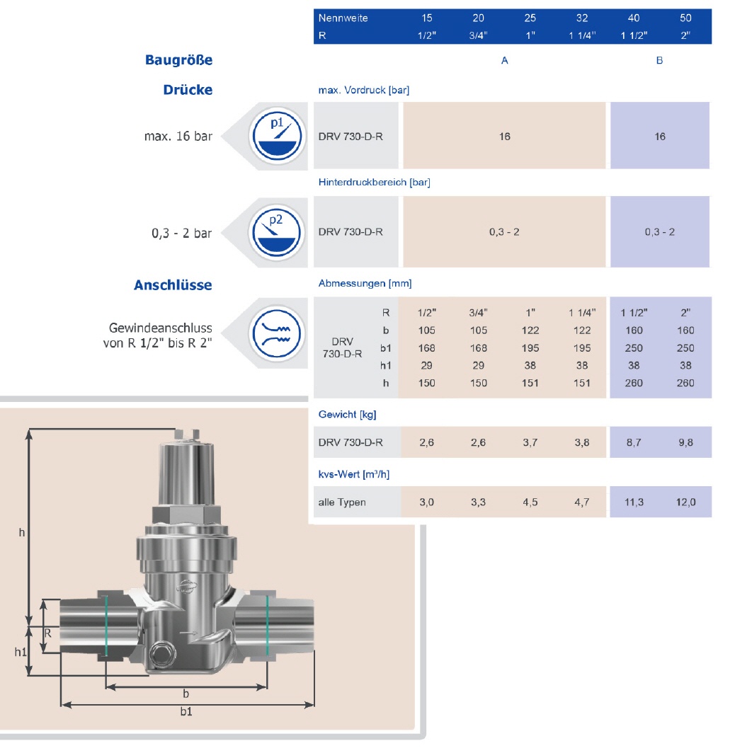 Druckminderer und verfügen über eine Vordruckkompensation. Die Kartuschenkonstruktion erlaubt einen einfachen Austausch der Innenteile. Aufgrund der verwendeten Dichtungsmaterialien eigenen sich die Baureihen hervorragend für Dampfanwendungen.