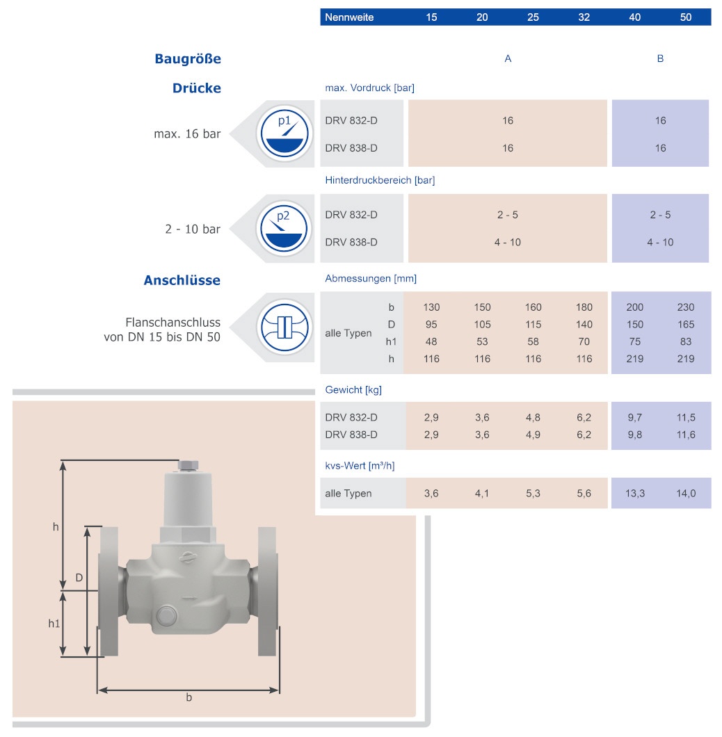 Druckminderer und verfügen über eine Vordruckkompensation. Alle Baugrößen sind mit Flanschen nach DIN, ANSI oder JIS lieferbar. Aufgrund der verwendeten Dichtungsmaterialien eigenen sich die Baureihen hervorragend für Dampfanwendungen.