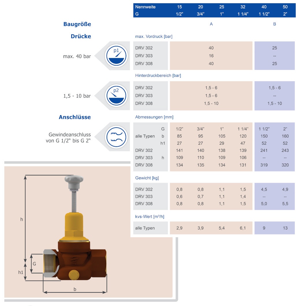 Druckminderer und verfügen über eine Vordruckkompensation. Die Kartuschenkonstruktion erlaubt einen einfachen Austausch der Innenteile.