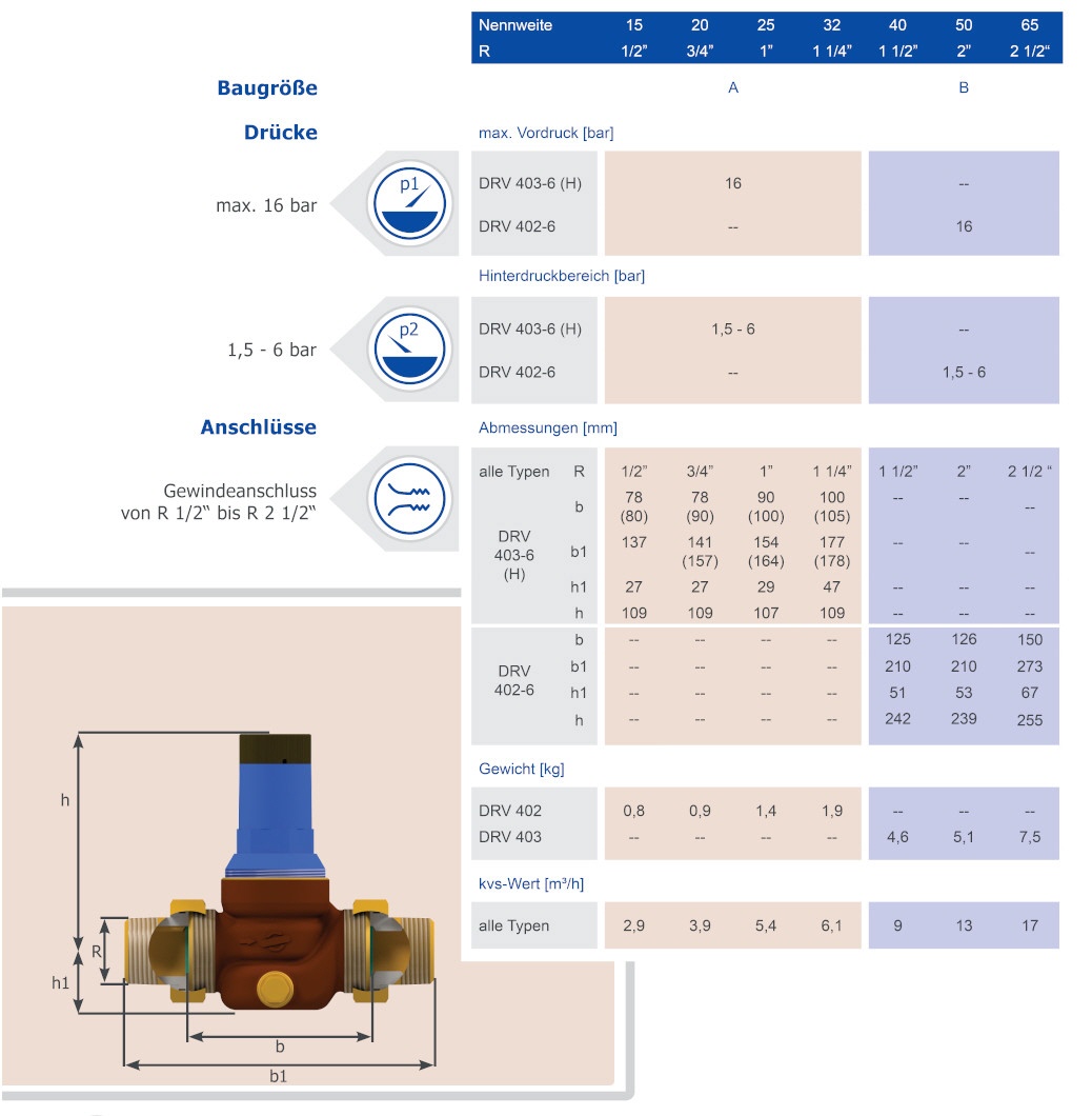 Druckminderer und verfügen über eine Vordruckkompensation. Die Kartuschenkonstruktion erlaubt einen einfachen Austausch der Innenteile.