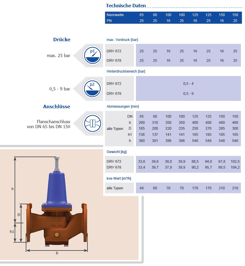 Druckminderer und verfügen über eine Vordruckkompensation. Alle Baugrößen sind mit Flanschen nach DIN, ANSI oder JIS lieferbar.