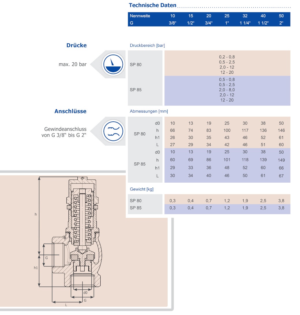 Direkt wirkendes, federbelastetes Ecküberströmventil für Dampf und gasförmige Medien sowie Flüssigkeiten. Beständig gegen Öl, bleifreies Benzin und Benzol